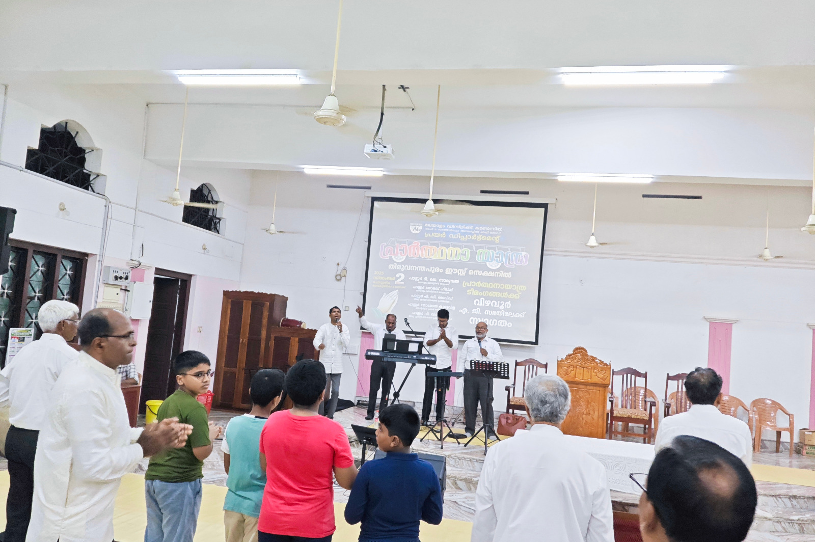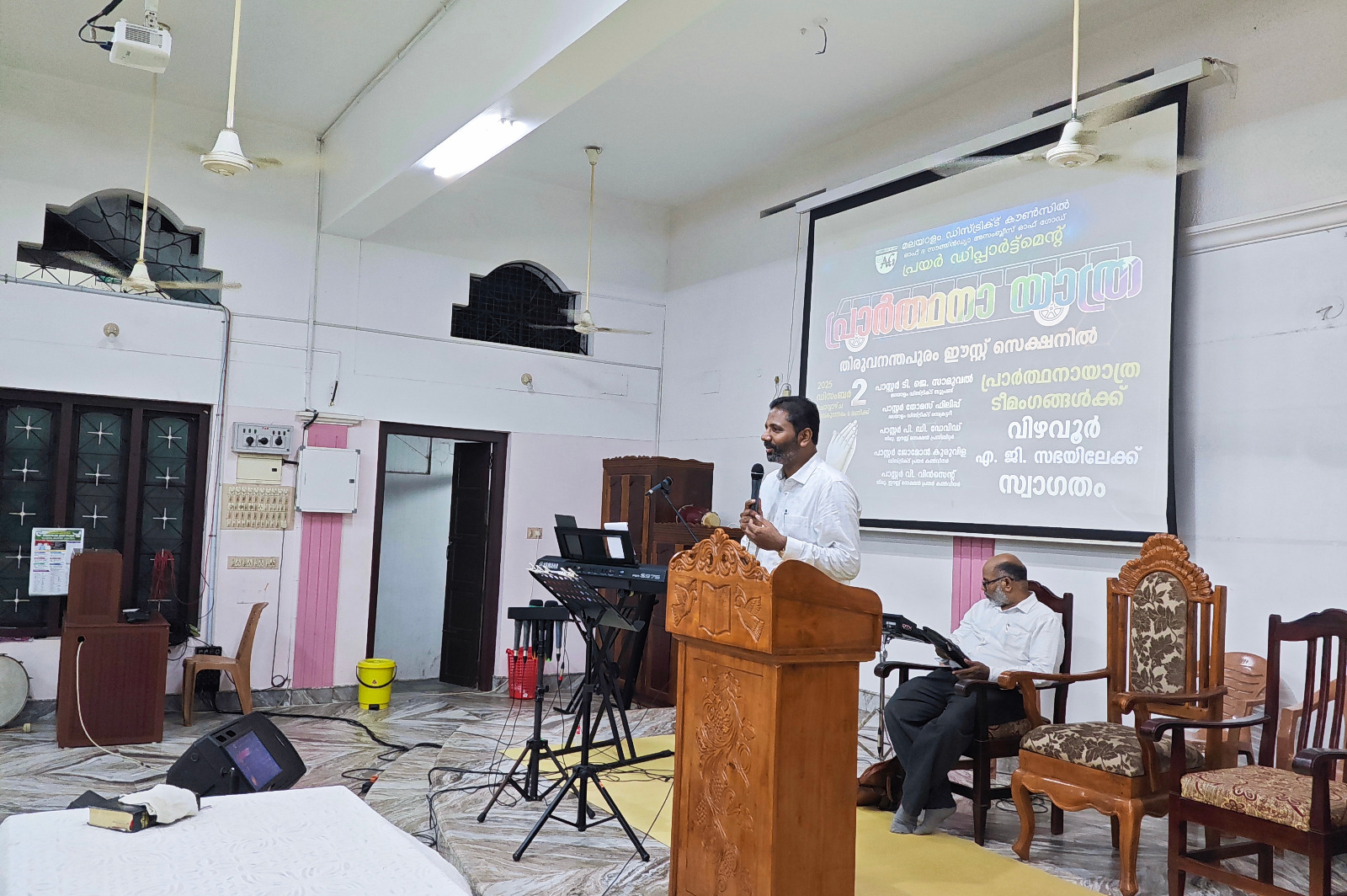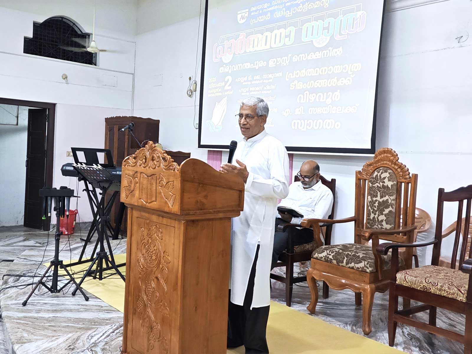 എ. ജി. മലയാളം ഡിസ്ട്രിക്ട് എക്സിക്യൂട്ടീവ് കമ്മിറ്റിയുടെയും ഡിസ്ട്രിക്ട് പ്രയര് ഡിപ്പാര്ട്ട്മെന്റിന്റെയും നേതൃത്വത്തില് 2025 ഡിസംബര് 1 മുതല് 13 വരെ തിരുവനന്തപുരം മുതല് തൃശ്ശൂര് വരെ നടന്ന പ്രാര്ത്ഥനായാത്ര ഡിസംബര് 2-ന് വൈകുന്നേരം വിഴവൂര് സഭയില് എത്തിച്ചേര്ന്നു. സൂപ്രണ്ട് പാസ്റ്റര് ടി. ജെ. സാമുവലും പ്രയര് ഡിപ്പാര്ട്ട്മെന്റ് കണ്വീനര് പാസ്റ്റര് ജോമോന് കുരുവിളയും സഭയില് നടന്ന മീറ്റിംഗിന് നേതൃത്വം നല്കി. തിരുവനന്തപുരം ഈസ്റ്റ് സെക്ഷന് പ്രസ്ബിറ്റര് പാസ്റ്റര് പി. ഡി. ഡേവിഡ് അദ്ധ്യക്ഷത വഹിച്ചു. 22 പേരടങ്ങുന്ന ടീം മലയാളം ഡിസ്ട്രിക്ടിന് സ്പോണ്സറായി ലഭിച്ച പുതിയ ബസ്സിലായിരുന്നു ഈ പര്യടനം നടത്തിയത്. 2-ാം തീയതി വൈകുന്നേരം 6 മുതല് 9 വരെ സഭയില് നടന്ന മീറ്റിംഗില് ദക്ഷിണമേഖലയിലെ അനേകം ദൈവമക്കള് പങ്കെടുത്തു. സഭാശുശ്രൂഷകന് പാസ്റ്റര് ബിജുകുമാര് ഡി. വി. യും ഈ പ്രാര്ത്ഥനാ ടീമില് അംഗമായിരുന്നു. കടന്നു വന്ന അതിഥികള്ക്ക് സഭയില് നിന്നും ഭക്ഷണവും സഭയിലെ വിവിധ ഭവനങ്ങളില് താമസവും ഒരുക്കിയിരുന്നു.