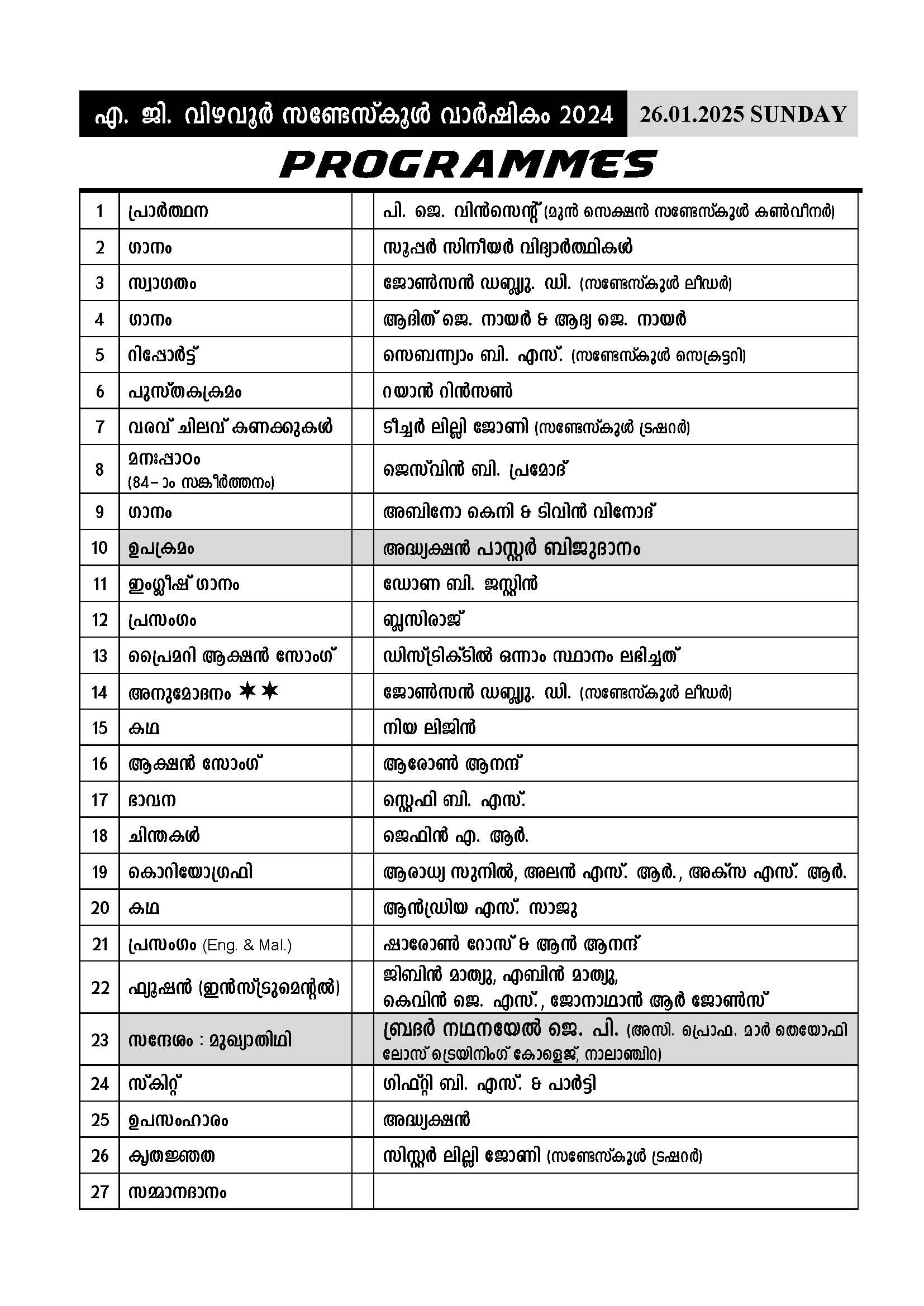 വിഴവൂര് സഭയിലെ 2024-ലെ സണ്ടേസ്കൂള് വാര്ഷികം 2025 ജനുവരി 26-ന് സഭാരാധനയോട് ചേര്ന്ന് നടന്നു. സഭാശുശ്രൂഷകന് പാസ്റ്റര് ബിജുകുമാര് ഡി. വി. അദ്ധ്യക്ഷത വഹിച്ച യോഗത്തില് മാര് തെയോഫിലോസ് ട്രെയിനിംഗ് കോളെജിലെ അസിസ്റ്റന്റ് പ്രൊഫസര് ബ്രദര് നഥനയേല് ജെ. പി. മുഖ്യാതിഥിയായിരുന്നു. വിദ്യാര്ത്ഥികളുടെ വിവിധ പ്രോഗ്രാമുകളും സമ്മാനദാനവും ഉണ്ടായിരുന്നു.
